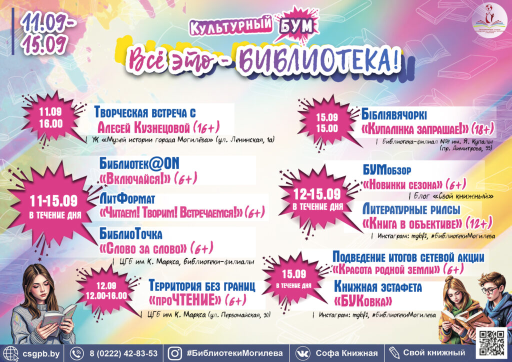 Присоединяйтесь к нам с 11 по 15 сентября на ЛитФормат «Читаем! Творим! Встречаемся!», где Вы можете посетить территорию без границ «проЧТЕНИЕ» (ул. Первомайская, 30), отправиться на бібліявячоркі «Купалінка запрашае!» (пр-т Димитрова, 55) и многое другое.