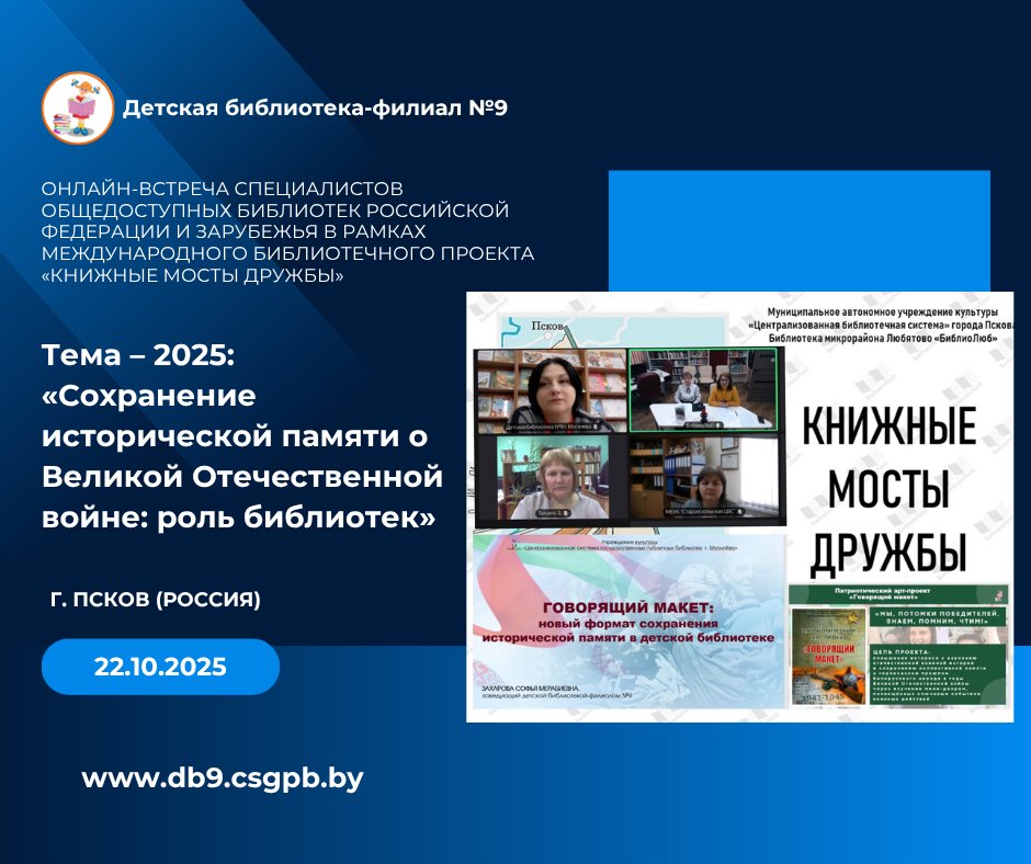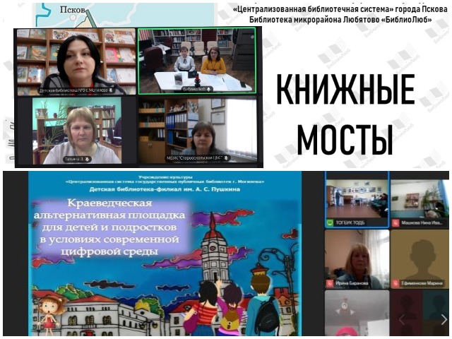 -в онлайн-встрече специалистов общедоступных библиотек Российской Федерации и зарубежья в рамках Международного библиотечного проекта «Книжные мосты дружбы» (МАУК «Централизованная библиотечная система» г. Пскова, модельная библиотека микрорайона Любятово «Библиолюб») — Захарова Софья Мерабиевна, заведующий детской библиотекой-филиалом № 9 с темой доклада «Говорящий макет: новый формат сохранения исторической памяти в детской библиотеке», в котором было освещено как традиционные библиотечные форматы могут успешно трансформироваться, отвечая на вызовы времени и потребности современного общества.