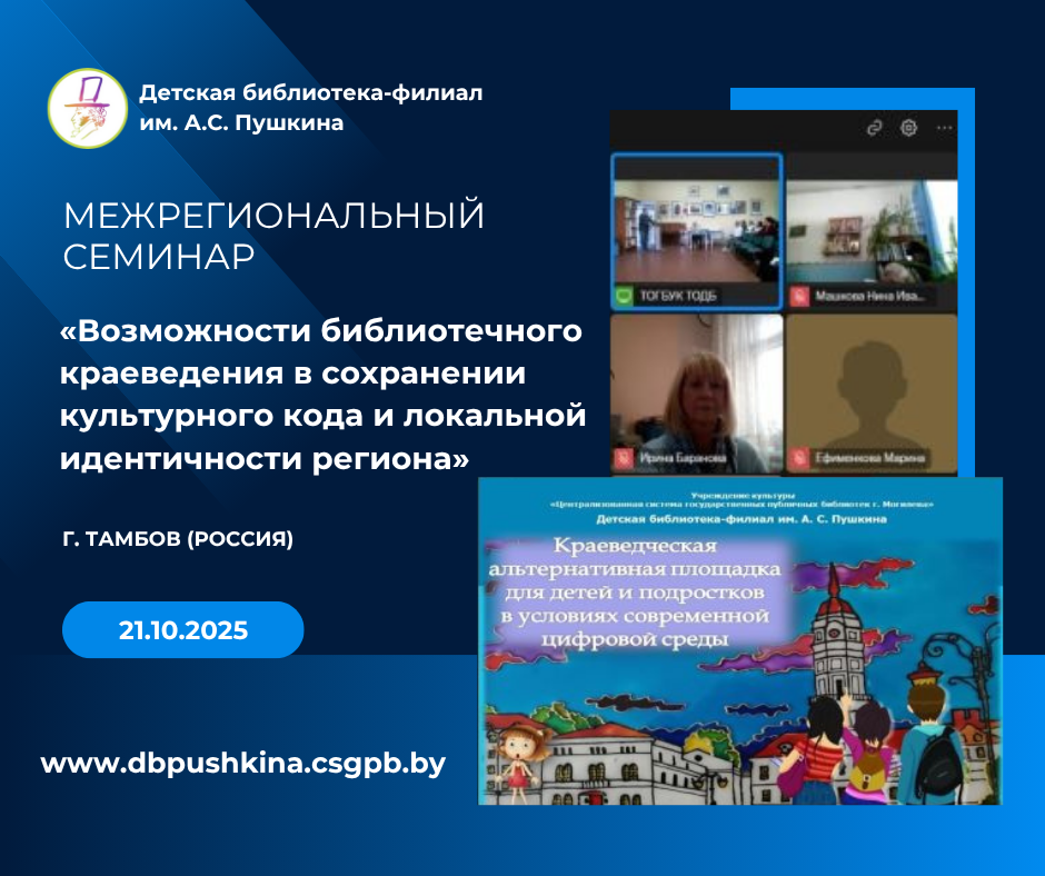 -в межрегиональном семинаре «Возможности библиотечного краеведения в сохранении культурного кода и локальной идентичности региона» (ТОГБУК «Тамбовская областная детская библиотека») — Баранова Ирина Леонидовна, заведующий информационно-сервисным сектором с темой доклада «Краеведческая альтернативная площадка для детей и подростков в условиях современной цифровой среды», где был представлен опыт работы по созданию информационного краеведческого ресурса «Детям о Могилеве»;