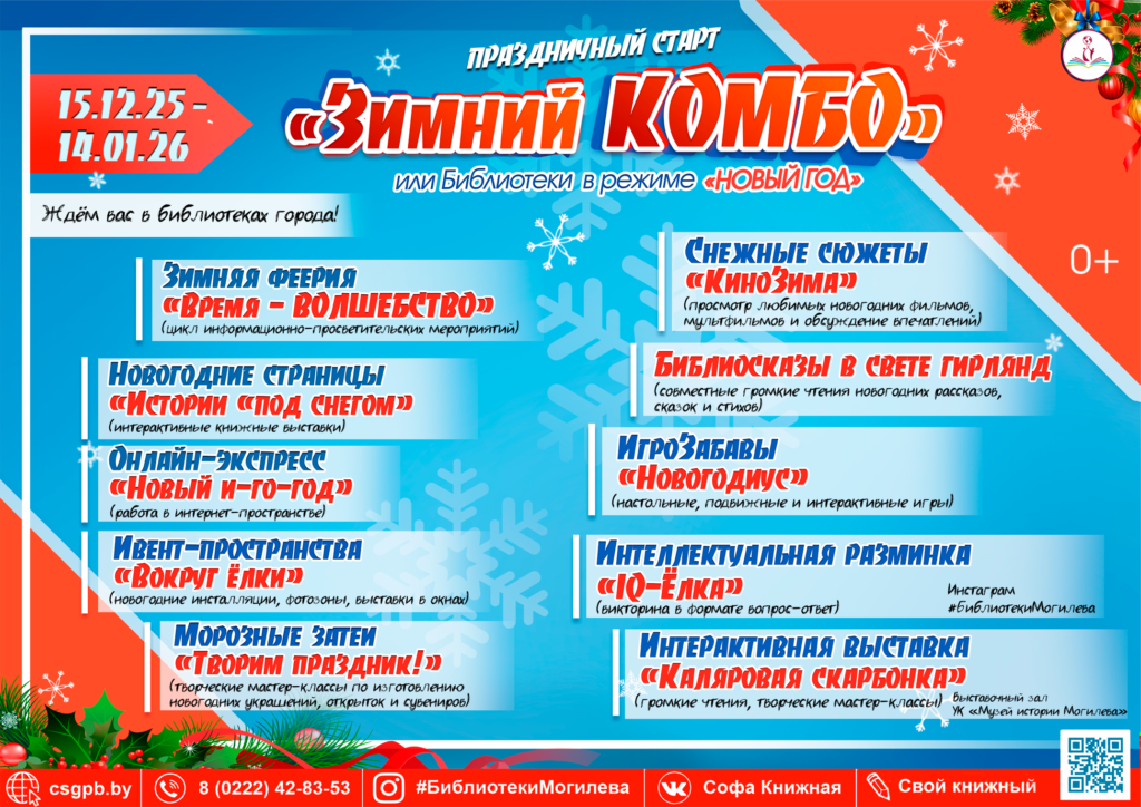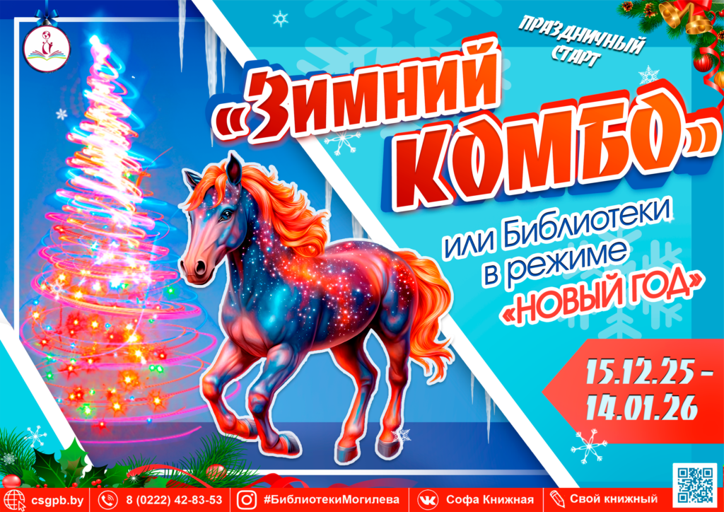 Приглашаем вас на увлекательные новогодние мероприятия праздничный старт «Зимний КОМБО, или Библиотеки в режиме «Новый год»! В этом году мы подготовили для вас программу, которая подарит сказочные моменты и погрузит в атмосферу волшебства.