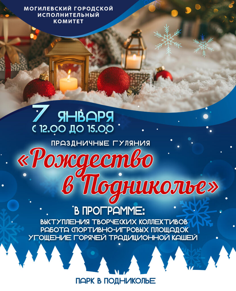 7 января с 12.00 до 15.00 в парке в Подниколье состоятся праздничные гуляния «Рождество в Подниколье», которые обещают быть интересными и насыщенными. В программе мероприятия запланированы выступления творческих коллективов УО «Могилевский государственный колледж искусств», работа спортивно-игровых площадок и угощение горячей традиционной кашей. Приглашаем всех желающих присоединиться к празднику и насладиться атмосферой Рождества!