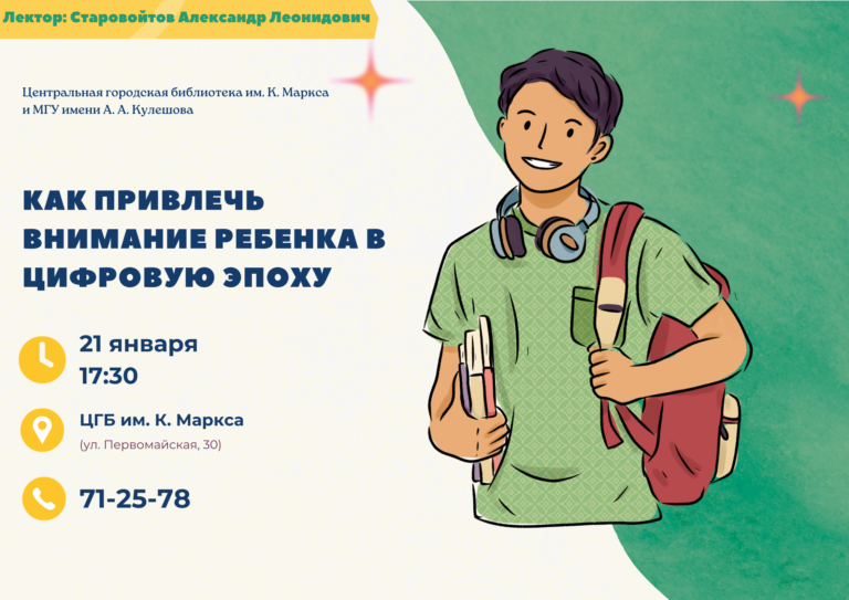 Центральная городская библиотека им. К. Маркса продолжает цикл очных встреч с преподавателями психологии из МГУ имени А.А. Кулешова. Очередная встреча Открытого психологического лектория состоится 21 января в 17.30 на тему «Как привлечь внимание ребенка в цифровую эпоху».
