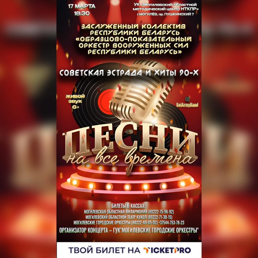 17 марта 2026 года в 18:30 в зале УК «Могилевский областной методический центр НТКПР» по адресу: г.Могилев, пр-т Пушкинский 7, состоится невероятное шоу — концерт Заслуженного коллектива Республики Беларусь «Образцово-показательный оркестр Вооруженных Сил Республики Беларусь» с новой программой «Песни на все времена»!