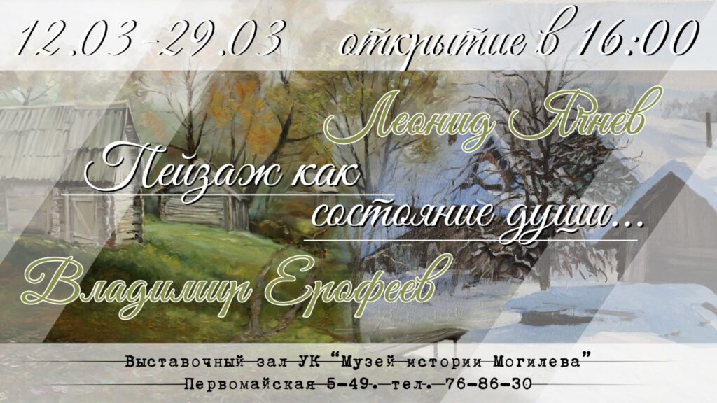 В выставочном зале Музея истории Могилева начнет работу выставочный проект «Пейзаж как состояние души» и будет действовать с 12 по 29 марта. Открытие выставки состоится 12 марта в 16:00. «Пейзаж как состояние души» это выставка двух талантливых художников могилевщины Владимира Ерофеева и Леонида Ячнева. Авторов объединяет общий жанр, в своих произведениях они создают образ малой Родины, воспевая красоты родного края и величественность реки Сож. Техника и подача каждого автора уникальна, полотна поэтичны и наполнены воздухом, что позволяет увидеть окружающий мир глазами художника и каждому зрителю ощутить себя частью этого волшебного мира. Владимир Ерофеев, Леонид Ячнев участники республиканских, областных, районных выставок. Их произведения находятся в государственных и частных коллекциях многих стран мира.