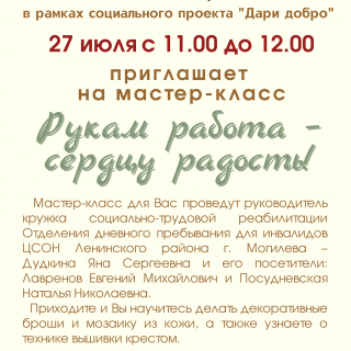 27 июля в Центральной городской библиотеке им. К. Маркса пройдет мастер-класс «Рукам работа — сердцу радость!» в рамках работы социального проекта «Дари добро». Приглашаем всех желающих на мастер-класс, который проведут Дудкина Яна...