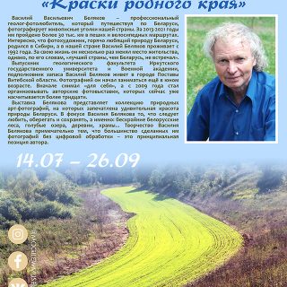 Фотовыставка Василия Белякова «Краски родного края» проходит в Могилевском краеведческом музее. Об этом сообщили в учреждении культуры. Выставка представляет коллекцию арт-фотографий, на которых запечатлена красота природы Беларуси.