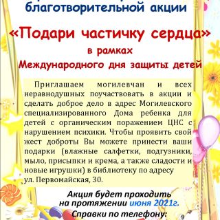 Центральная городская библиотека им. К.Маркса приглашает всех неравнодушных могилевчан принять участие в благотворительной акции «Подари частичку сердца», которая будет проходить в рамках социального проекта «Дари добро» в течение июня.